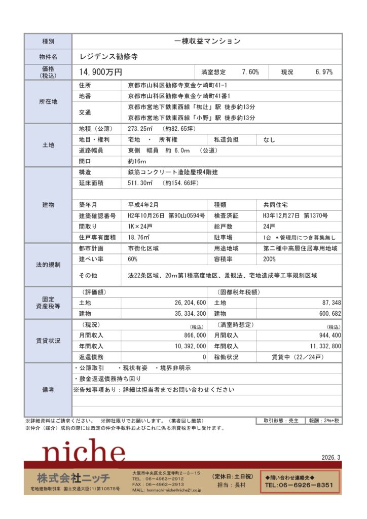 ホーム » お知らせ » 価格変更「京都市山科区一棟収益マンション 14,900万円 7.60%」価格改定いたしました
