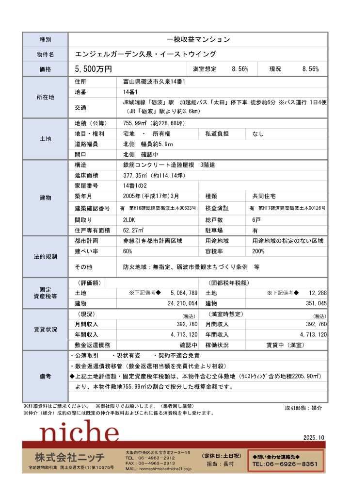 価格変更「富山県砺波市一棟収益マンション 5,500万円 8.56%」
