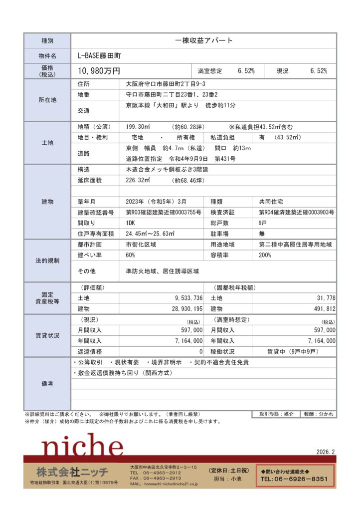 新規物件「守口市一棟収益アパート 10,980万円 6.52%」