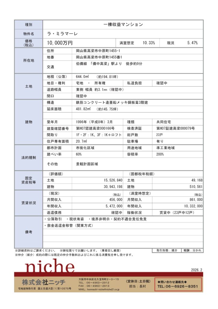 ホーム » お知らせ » 新規物件「岡山県高梁市一棟収益マンション 10,000万円 10.33%」アップいたしました