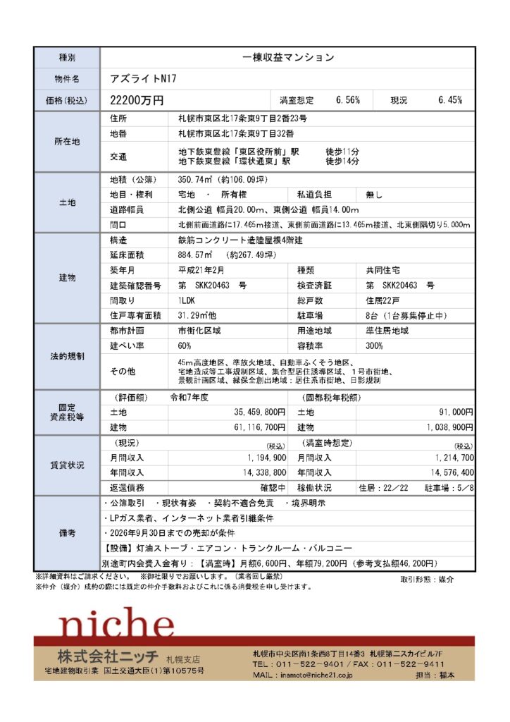 新規物件「札幌市一棟収益マンション 22,200万円 6.56%」アップいたしました