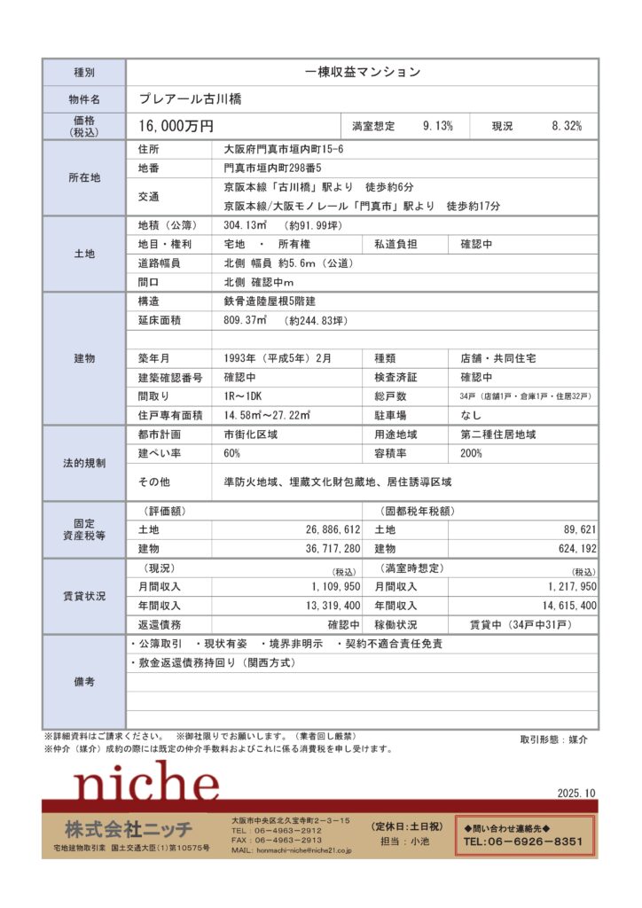 新規物件「門真市一棟収益マンション 16,000万円 9.13%」
