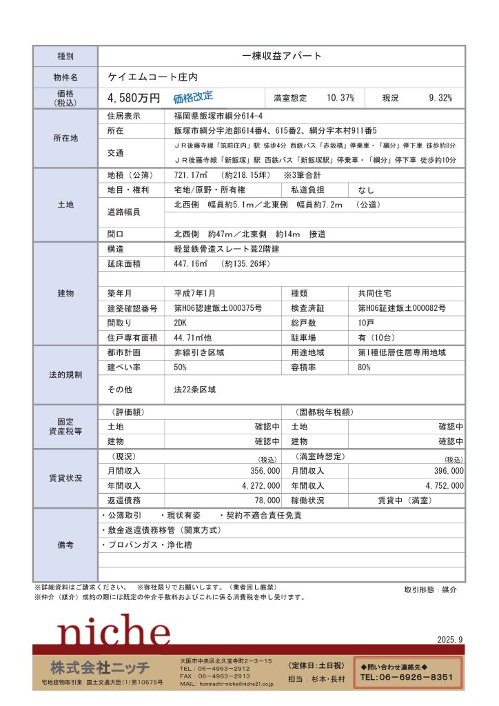 ホーム » お知らせ » 価格変更「福岡県飯塚市一棟収益アパート 4,580万円 10.37%」価格改定いたしました