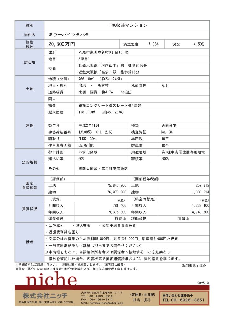 ホーム » お知らせ » 利回り変更「八尾市一棟収益マンション 20,800万円 7.08%」 に変わりました