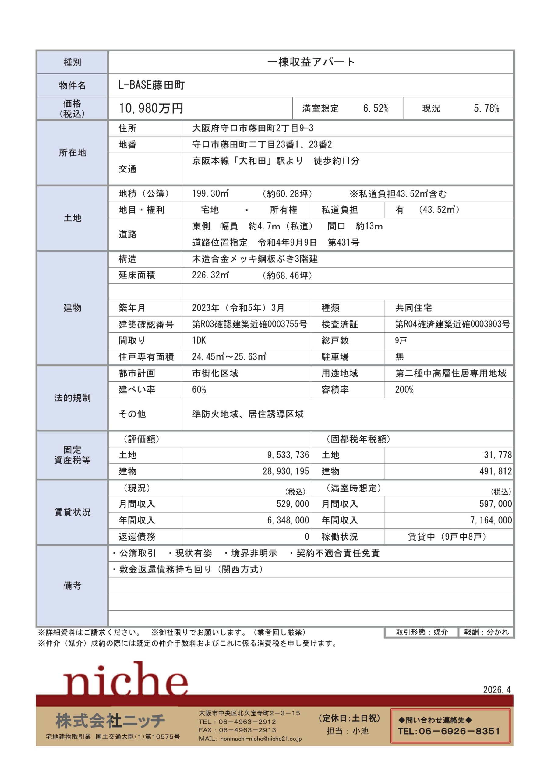 | その他 | ・公簿取引 ・現状有姿 ・境界非明示 ・契約不適合責任免責 ・敷金返還債務持回り(関西方式) 令和8年4月10日現在 (広告有効期限 令和7年5月31日) |