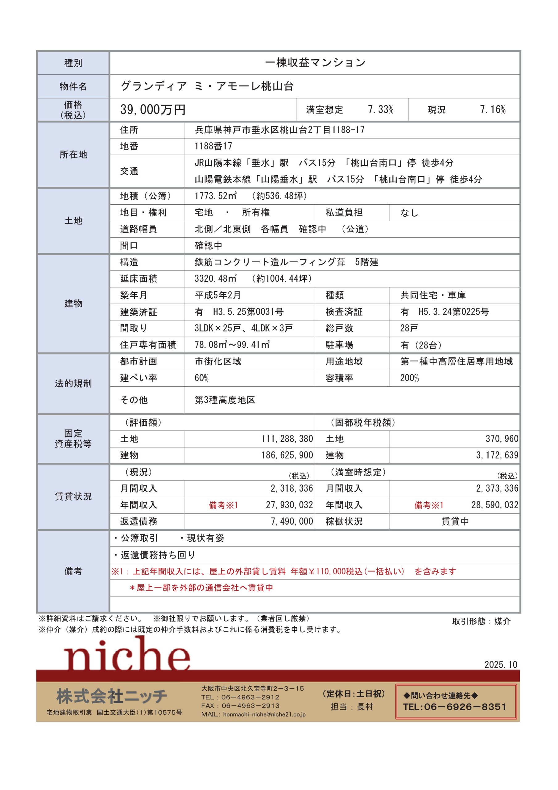 神戸市垂水区一棟収益マンション 39,000万円 7.33%