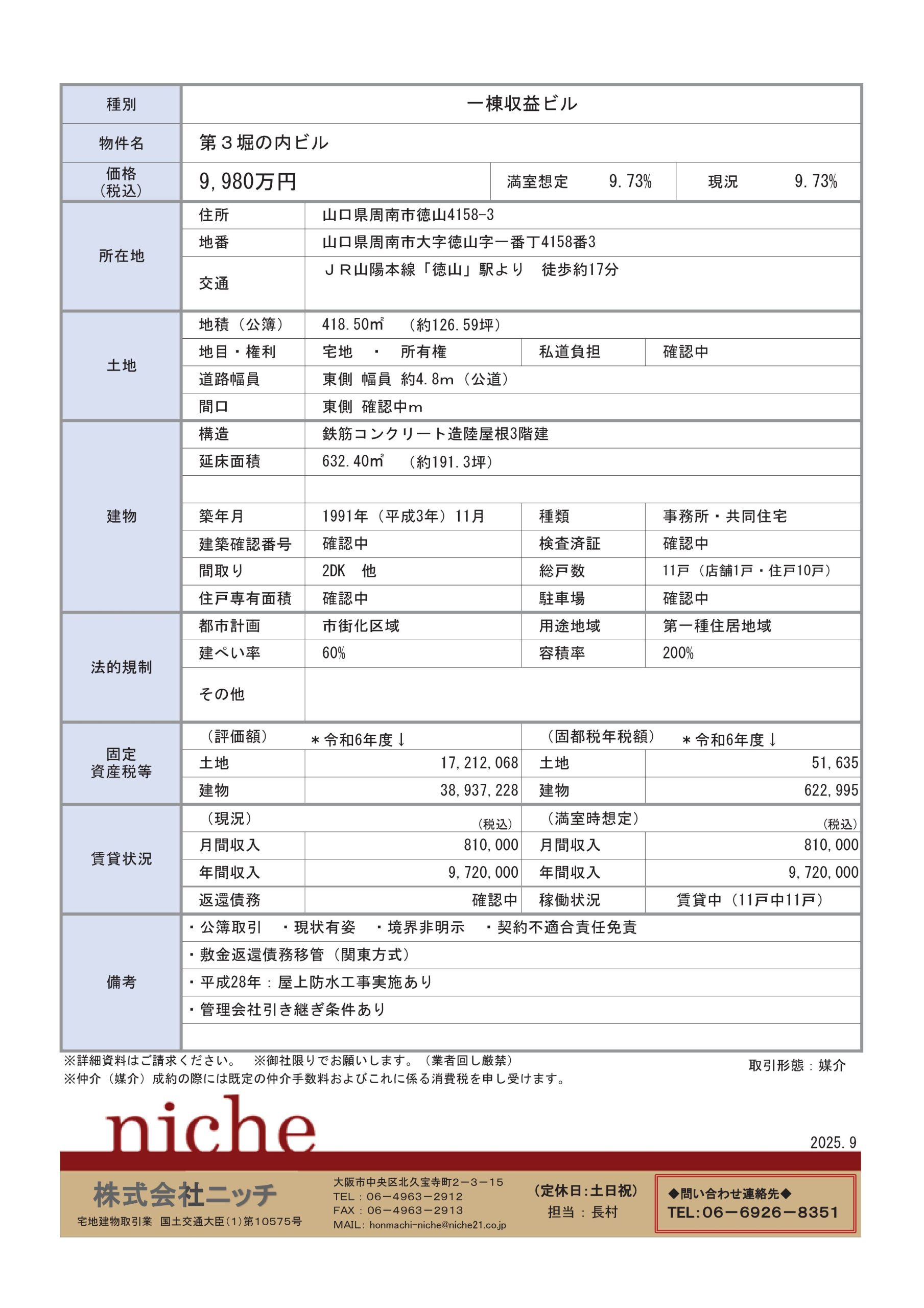 周南市一棟収益マンション 9,980万円 9.73%