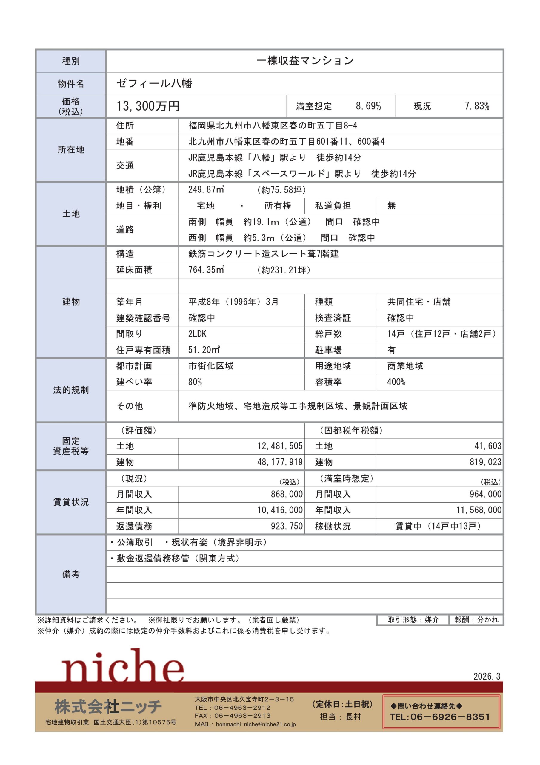 福岡県北九州市一棟収益マンション 13,300万円 8.69%